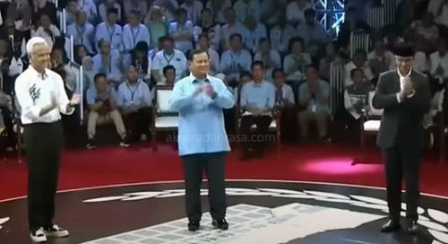 On the stage the three candidates stood without a podium with all candidates being invited to answer questions within just two minutes from the panelists. Fellow candidates are also welcome to ask each other about policies for Indonesia if they are elected. The incident that was highlighted was when Prabowo clearly pouted his lips at Anies when Anies answered a question asked by the panelists.